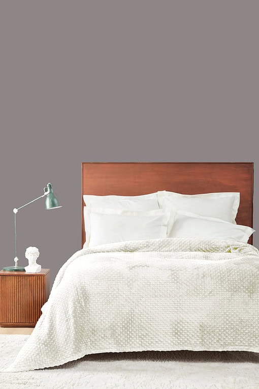 • DAPHNE Tomurčuk Deka u svijetlo roza boji na modernoj spavaćoj sobi s drvenim uzglavljem, prirodnim ukrasima i minimalističkim dizajnom, idealno za udoban i elegantan prostor za odmor.